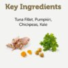 Filet z tuńczyka 45%, bulion rybny, dynia 10%, ciecierzyca 10%, jarmuż 5%.