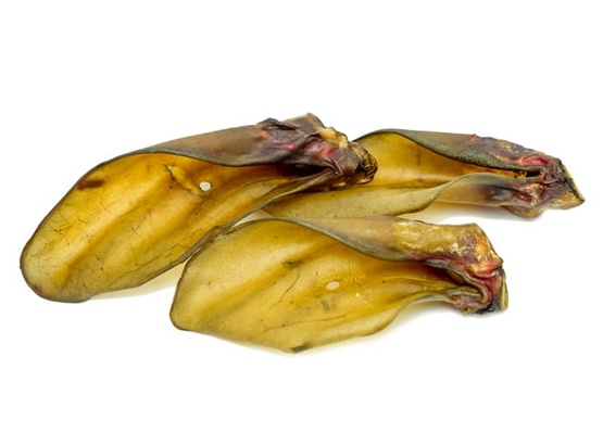 Chrupiący gryzak dla psa o dość dużych rozmiarach (razem z uchem wewnętrznym – czyli tym pysznym mięsnym ringiem, który jest tak bardzo lubiany przez psy), mało intensywnym zapachu, niebrudzący.