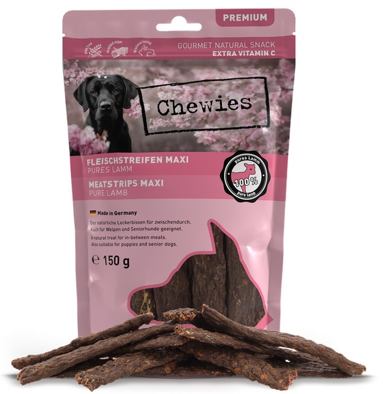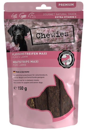 Chewies Meat/Fish Strips Maxi są tworzone z mielonego i delikatnie suszonego na powietrzu mięsa z dodatkiem witaminy C. Dzięki specjalnej produkcji wysokiej jakości składniki odżywcze mięsa są prawie całkowicie zachowane. Paski mięsne/rybne do żucia to smaczny i zdrowy przysmak między posiłkami. Są wyprodukowane w Niemczech. Paski Chewies Meat/Fish Strips Maxi mają przybliżoną długość 10 cm i od 2 do 3 cm szerokości. Można je także łatwo podzielić.