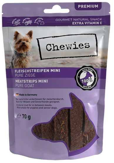 Nasze cudownie mięsiste przekąski dla psów są teraz dostępne w małych rozmiarach – polecane szczególnie dla małych ras, szczeniąt i starszych psów. Paski Chewies Meat/Fish Strips Mini składają się z czystego mięsa z dodatkiem witaminy C. Dzięki delikatnemu suszeniu powietrzem wysokiej jakości składniki odżywcze mięsa są prawie całkowicie zachowane. Paski mięsne/rybne do żucia to pyszna i zdrowa nagroda między posiłkami. Są wyprodukowane w Niemczech. Można je także łatwo podzielić.