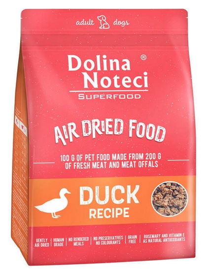Danie z kaczki Dolina Noteci SUPERFOOD w formie suszonej to pełnowartościowa karma, której skład surowcowy uwzględnia składniki odżywcze i biologicznie czynne. 100 g gotowego produktu powstaje z aż 200 g świeżego mięsa i produktów pochodzenia zwierzęcego z kaczki, wołowiny, kurczaka i wieprzowiny. Co ważne, proces suszenia pozwala zachować jak najwięcej składników odżywczych pochodzących z surowców użytych do produkcji karmy.
