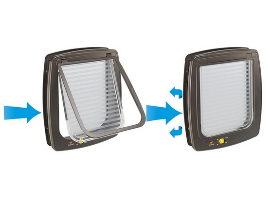 Dodatkowo modele Swing 5, 7 i 9 są wyposażone we wskaźnik przejścia, który pomoże ci błyskawicznie ocenić, gdzie znajduje się twoje zwierzę. Wskaźnik przejścia to "flaga" umieszczona na dnie klapy – będzie wskazywała kierunek, w którym twój pupil ostatnio przechodził.