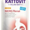 Wspomaganie czynności nerek w przewlekłej niewydolności nerek i ograniczanie tworzenia się oksalonu. Karma Kattovit Feline Diet – NIERE/RENAL została specjalnie opracowana, aby zapewnić kotom obniżoną zawartość białka, poprzez zastosowanie wysokiej jakości białka w łatwo przyswajalnym składzie. Wysoki poziom białka może mieć szkodliwy wpływ na nerki. Decydującym czynnikiem jest zawartość białka w stosunku do ilości energii. W Kattovit NIERE/RENAL, w przeciwieństwie do konwencjonalnej żywności, tylko około połowa energii pochodzi z białka. Wzbogacenie cytrynianem potasu ma działanie alkalizujące mocz i dlatego może zapobiegać tworzeniu się kryształów szczawianu (profilaktyka szczawianowa). Zmniejsza się zawartość fosforu i sodu.