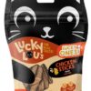 Wypróbuj je, warto! Oczywiście są bez zbóż i bez dodatku cukru – Lucky Lou nie pakuje takich rzeczy do torebki! Dzięki zawartości aż 87% składników pochodzenia zwierzęcego, Lucky Ones są przyjazną kotom przekąską między posiłkami. Są odpowiednie dla wszystkich kotów, od kociąt po seniorów. W końcu z entuzjazmem bawimy się do późnej starości, a kto może się oprzeć pełnej akcji uczcie?