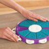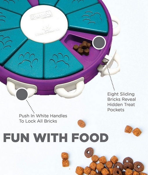 Węsząc i pomagając sobie łapą lub pyszczkiem pies natrafi na przegródki, które będzie musiał odblokować, zanim sięgnie po ukryte w nich łakocie. System blokady polega na przesuwaniu uchwytu znajdującego się na brzegu zabawki. Sprawdź czy Twój czworonóg jest geniuszem!