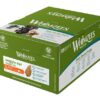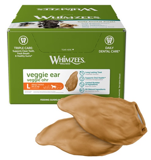 Box WHIMZEES Wege Ucho zawiera 18 szt. gryzaków w kształcie ucha. Jeden gryzak ma ok. 17,5 cm długości i waży ok. 55 g.