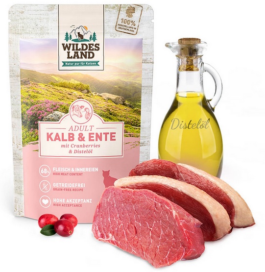 Dla dobrego samopoczucia Twojego kota niezbędna jest zbilansowana dieta zawierająca wysokiej jakości białka. Mokra karma Wildes Land opiera się na autentyczności i sile natury. Właśnie dlatego odmiana Kalb & Ente z Wildes Land nie zawiera zbóż i zawiera wyłącznie wysokiej jakości źródła białka oraz żurawinę, co zapewnia żywienie odpowiednie dla gatunku.