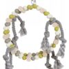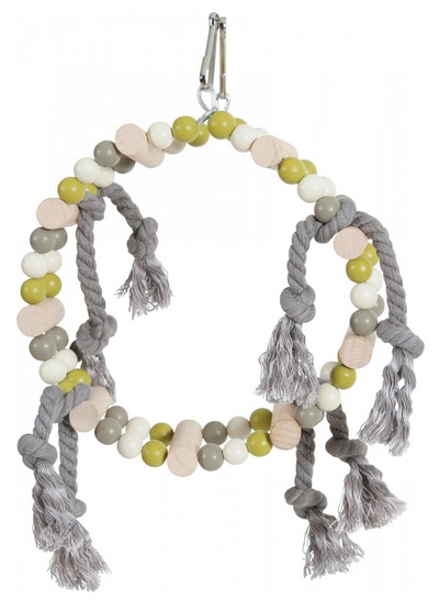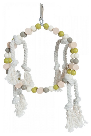 Huśtawka w kształcie obręczy z koralików, z drewnianymi szczebelkami i sznureczkami to idealny dodatek do klatki dla ptaków. Zapewni zwierzęciu dużo rozrywki, dostarczy stymulacji intelektualnej i urozmaici jego otoczenie.